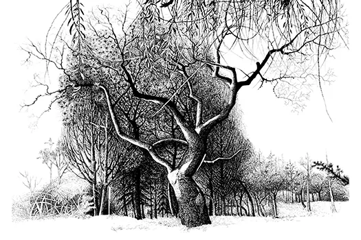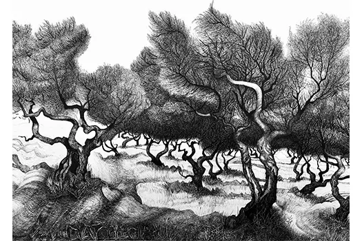 Ağaçların çizgisel dinginliği, köklenme, aidiyet, hafıza ve sessiz derinliği gibi insanın içsel taraflarını taşır. Figüratif sahneler ise insanın dışa dönük yüzünü; hareketi, arayışı, kırılganlığı ve yaşamın absürd ritmini anlatır. İki dünya zıtlıktan doğmaz; aynı benliğin birbirini tamamlayan iki akışından doğar.